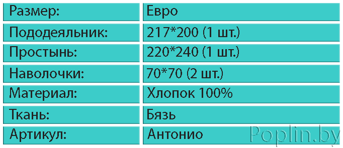 Вы хотите купить самый красивый бязевый комплект постельного белья "Антонио", размер евро? Это совсем просто! Купить его можно прямо сейчас - позвоните нам по телефону МТС +375 - 33 - 6728369 или Велком +375 - 29 - 6889458. Интернет-магазин Poplin.by предлагает бязевое белье, евро размера только из ЭКО продукта- натуральный 100% хлопок.