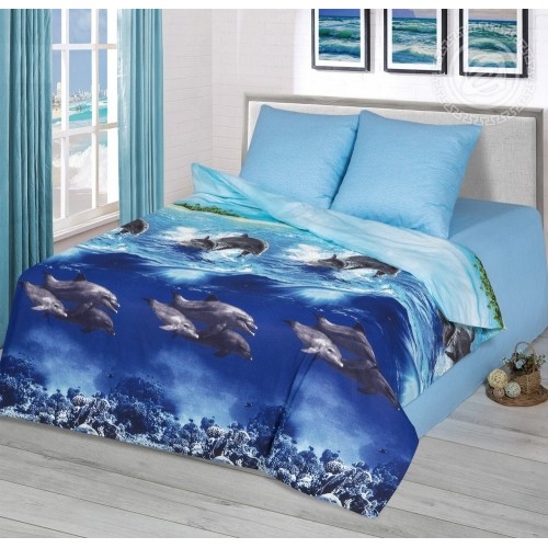 Комплект постельного белья Голубая лагуна - это обаяние подводного мира. Для ткани выбраны голубой и синий цвета, дельфины изображенные на постельке уберегут вас от злобного взгляда и дадут в спальню слаженность и гармонию. Купить постельное белье с изображением дельфинов, значит привлечь любовь и дружбу, взаимоотношение в кругу семьи, убережет от стычек и неурядиц. Синий и голубой смотрятся привлекательно, тот и другой отлично подходят для спальни. Голубой тон подходящим способом воздействует на нервную систему, одаряет спокойствием, предотвращает всевозможные воспалительные процессы.