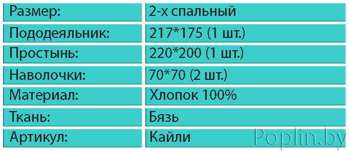 Купить 2 спальное постельное белье материал бязь артикул"Кайли" Вы можете в нашем интернет-магазине Poplin.by. Не дорого, но отличного качества купить постельное белье по всей Беларуси можно у нас. Комплект"Кайли" содействует глубокому и безупречному сну, при этом создаст в комнате комфорт и уют.