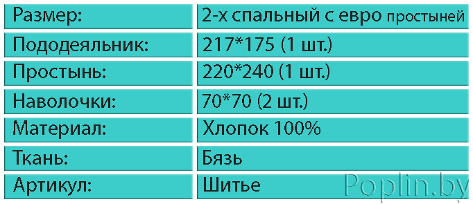 | Простынь | 1 шт. 220 см * 240 см |