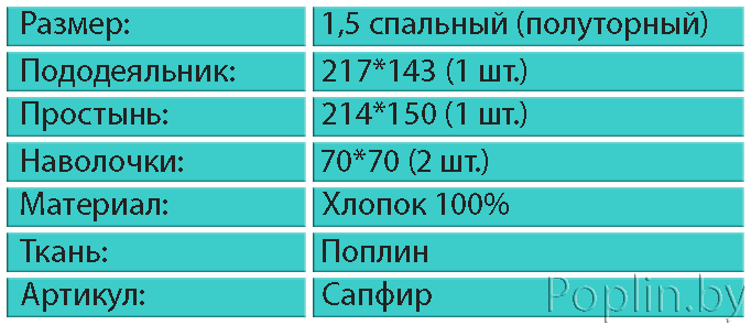 Купить полуторный комплект из поплина артикул "Сапфир" в Минске или в любом другом населенном пункте Беларуси Вы можете в нашем интернет-магазине Poplin.by. Купить поплиновое постельное белье 1,5 спального размера можно через корзину, или заказать по телефонам. Комплект пошит из ткани произведенной из 100% натурального хлопка, экологически чистой, не вызывающей ни каких аллергических реакций (ЭКО продукт), поэтому такое белье отлично подойдет и для взрослых, детей и подростков. Вы определились?! Купить комплект постельного белья, материал поплин, артикул "Сапфир" можно прямо сейчас, позвоните нам по телефону: А1 +375-29-688-94-58; МТС +375-33-672-83-69.