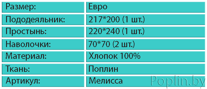 Постельное белье из поплина евро размера Мелисcа купить в Минске, с доставкой по всей Беларуси. Качественное постельное белье купить не дорого Вы можете в нашем Интернет - магазине. Купить постельное белье Мелисcа размер евро не сложно - закажите комплект через корзину, или позвоните нам по телефону МТС +375 - 33 - 6728369 или А1 +375 - 29 - 6889458 и мы доставим Вам комплект по Беларуси с помощью РУП "Белпочта", или евро почтой посылкой на Ваш адрес, в Минске курьером.