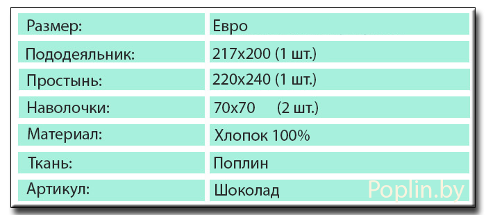 Постельное белье из поплина евро размера "Шоколад" купить можно и в Минске, и по всей Беларуси. Качественное постельное белье купить не дорого Вы можете в нашем Интернет - магазине. Купить постельное белье Шоколад размер евро не сложно - закажите комплект через корзину, или позвоните нам по телефону МТС +375 - 33 - 6728369 или А1 +375 - 29 - 6889458 и мы доставим Вам комплект по Беларуси с помощью РУП "Белпочта", или евро почтой посылкой на Ваш адрес, в Минске курьером.