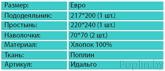 Постельное белье из поплина евро размера Идальго купить в Минске, с доставкой по всей Беларуси. Качественное постельное белье купить не дорого Вы можете в нашем Интернет - магазине. Купить постельное белье Идальго размер евро не сложно - закажите комплект через корзину, или позвоните нам по телефону МТС +375 - 33 - 6728369 или А1 +375 - 29 - 6889458 и мы доставим Вам комплект по Беларуси с помощью РУП "Белпочта", или евро почтой посылкой на Ваш адрес, в Минске курьером.
