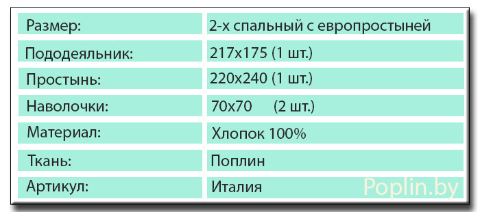 Купить поплиновое постельное белье размер двухспальный с большой простыней (евро простынь) артикул Италия Вы можете в нашем Интернет - магазине Poplin.by. Не дорогое, но качественное постельное белье Италия 2 спального размера с простыней евро купить можно в любое время, заказав комплект через корзину.
